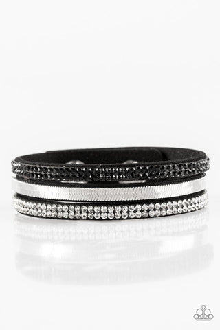 "I Mean Business" Black LEATHER Silver Studs, Chains, Rhinestones Snap Bracelet