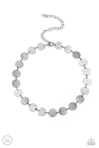 Hammered in shimmery detail, a shiny collection of dainty gunmetal discs delicately link into a blinding display around the neck. Features an adjustable clasp closure.