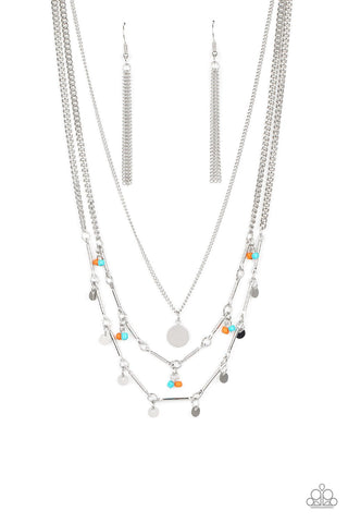 A silver disc is suspended above two mismatched silver chains featuring a mismatched array of silver bars, silver discs, and pairs of blue and orange seed beads. The dainty display delicately layers below the collar, creating a colorful fringe. Features an adjustable clasp closure.